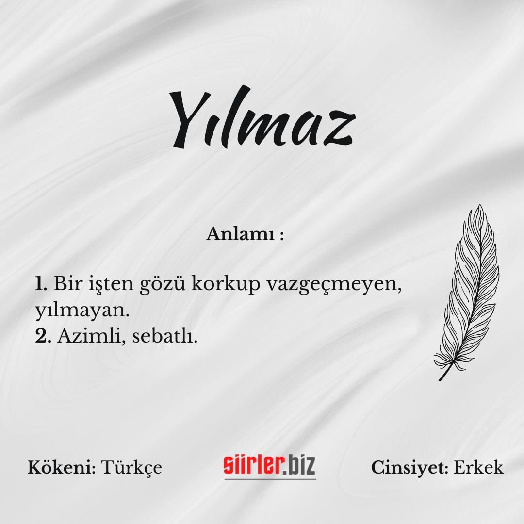 Yılmaz İsminin Anlamı, Yılmaz İsminin Sözlük Anlamı, Yılmaz İsminin Ebced değeri gibi Yılmaz ismi ile alakalı birçok bilgiye ulaşabilirsiniz.